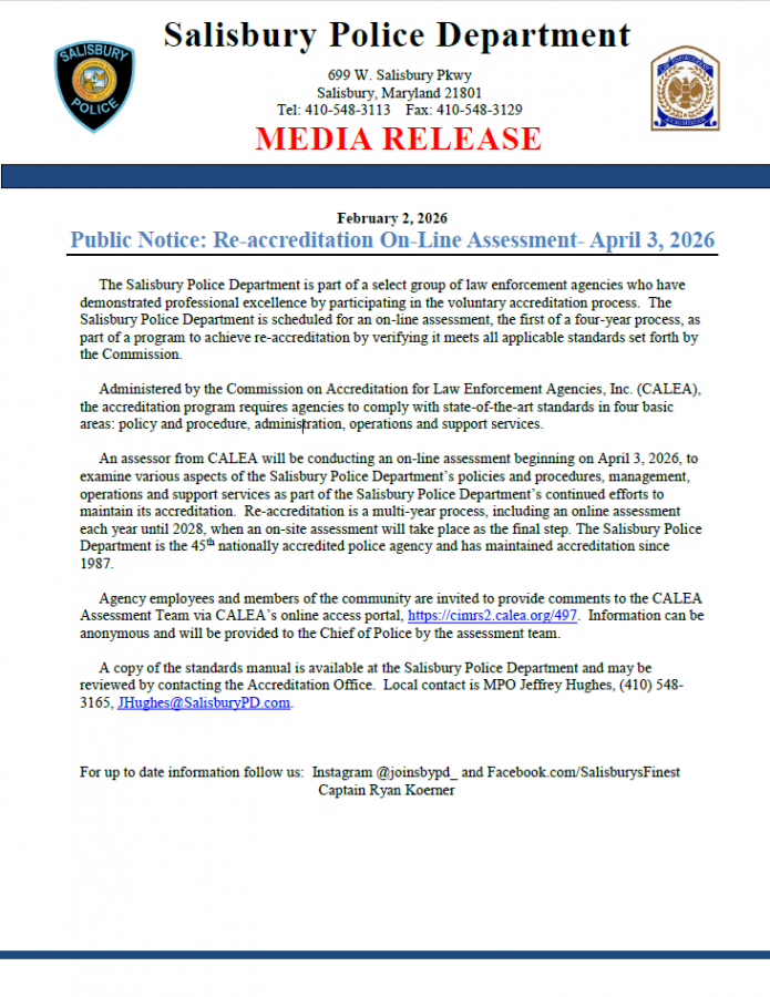 An assessor from CALEA will be conducting an on-line assessment beginning on April 3, 2026, to examine various aspects of the Salisbury Police Department’s policies and procedures, management, operations and support services as part of the Salisbury Police Department’s continued efforts to maintain its accreditation. Re-accreditation is a multi-year process, including an online assessment each year until 2028, when an on-site assessment will take place as the final step. The Salisbury Police Department is the 45th nationally accredited police agency and has maintained accreditation since 1987.