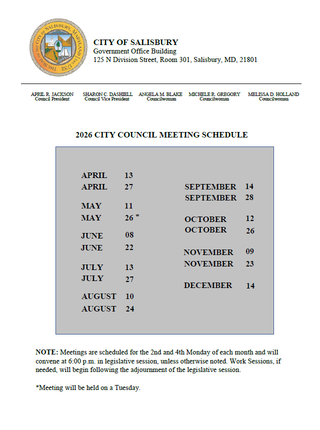 Effective April 1, 2026 the City of Salisbury Council meetings will be held the 2nd and 4th Monday of each month unless otherwise noted. The revised 2026 schedule is attached for your convenience. The schedule is also available on the Council’s website linked here: Updated-Meeting-Schedule-3.31.26.pdf