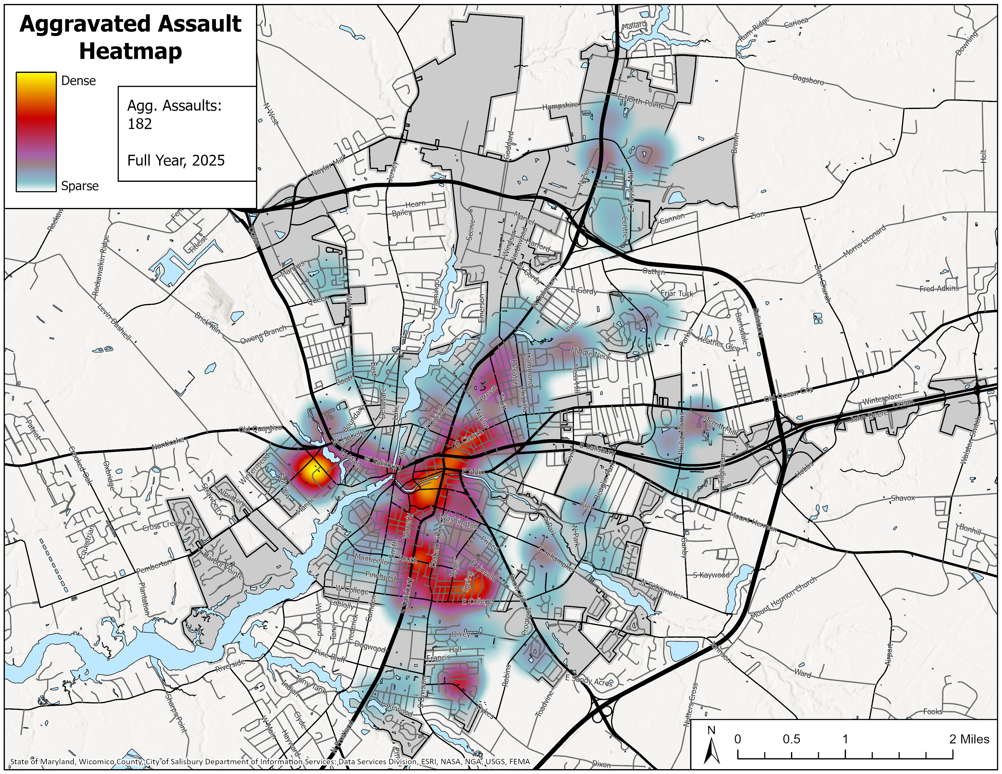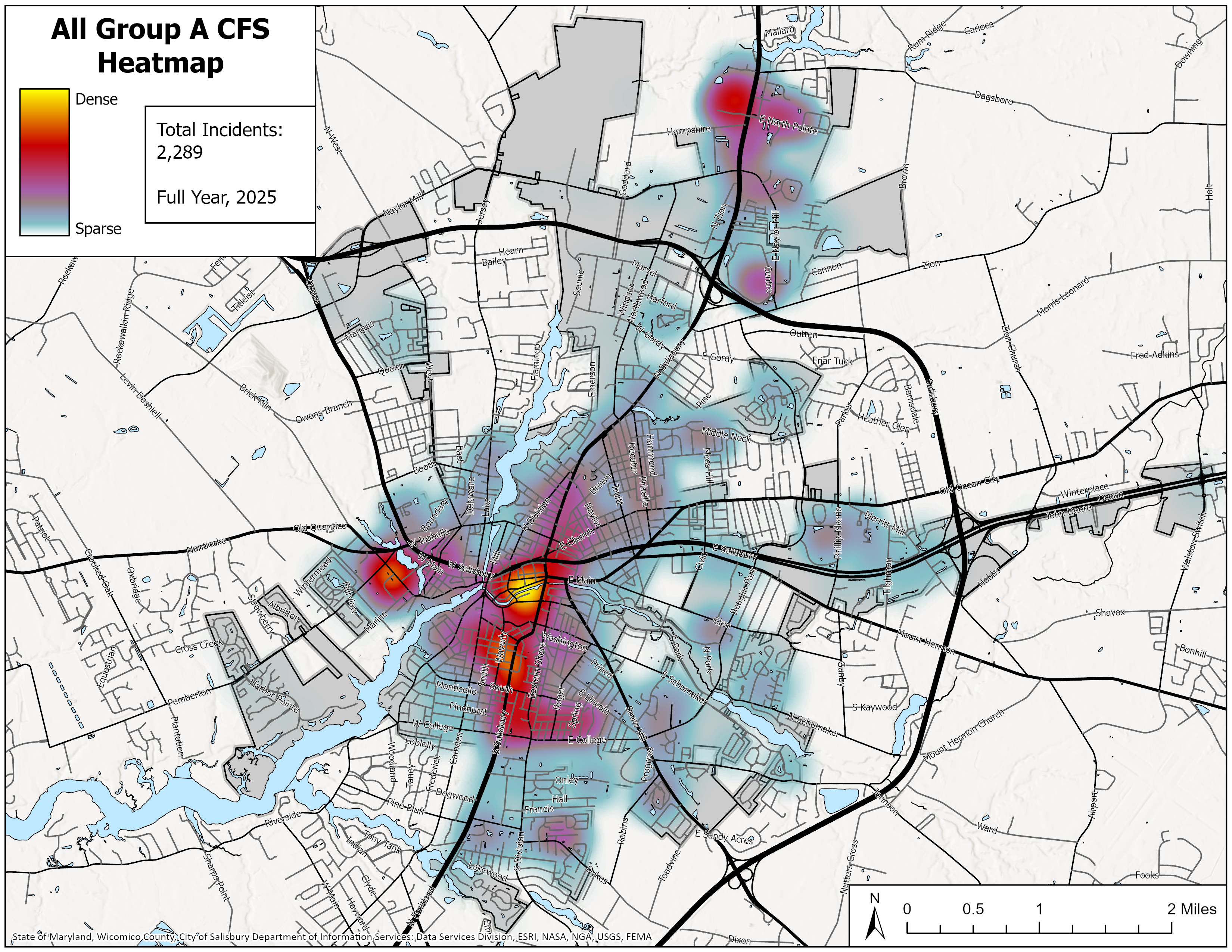 Click on the other tabs below to view heatmaps of Group A calls for service (CFS), and call types of particular concern that the City of Salisbury Police Department has responded to.
