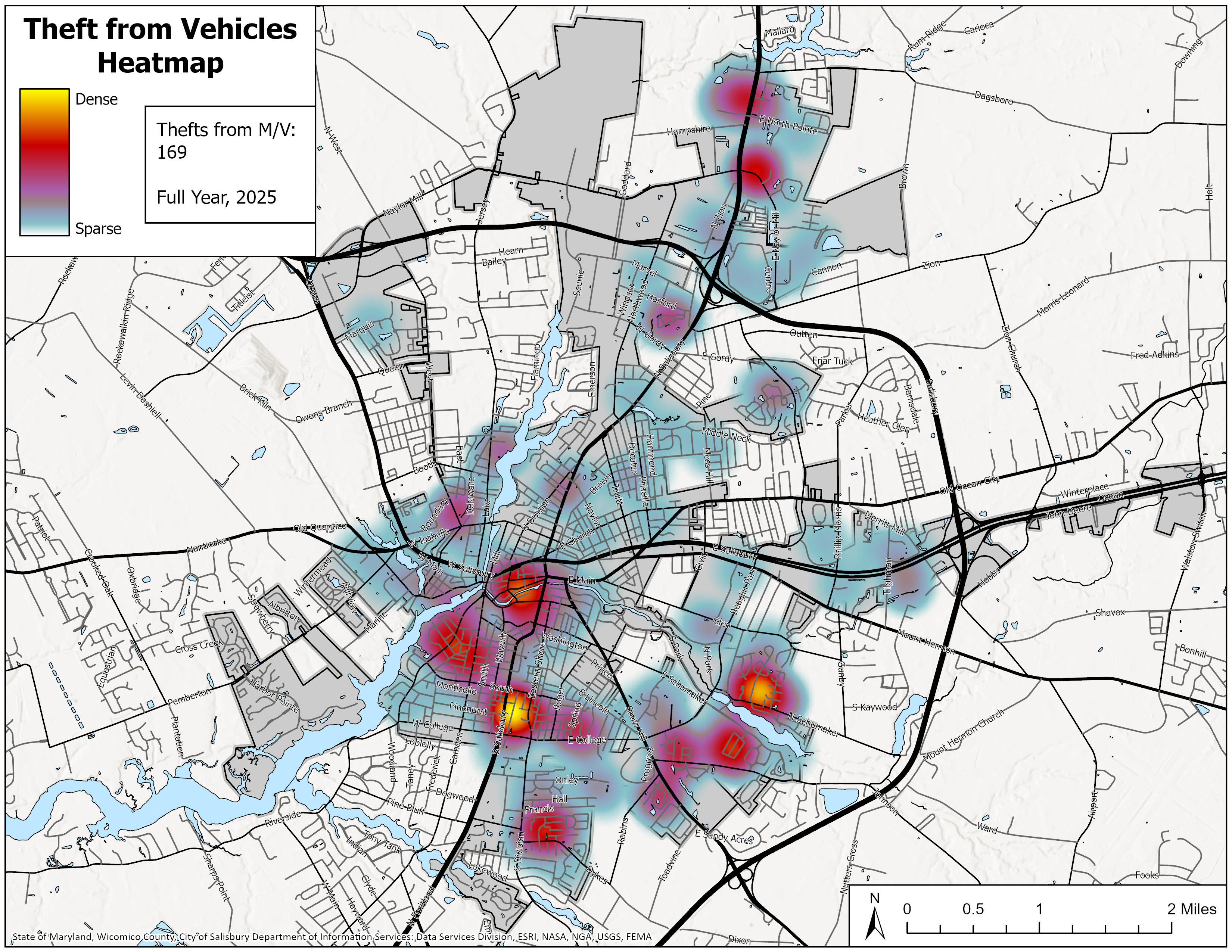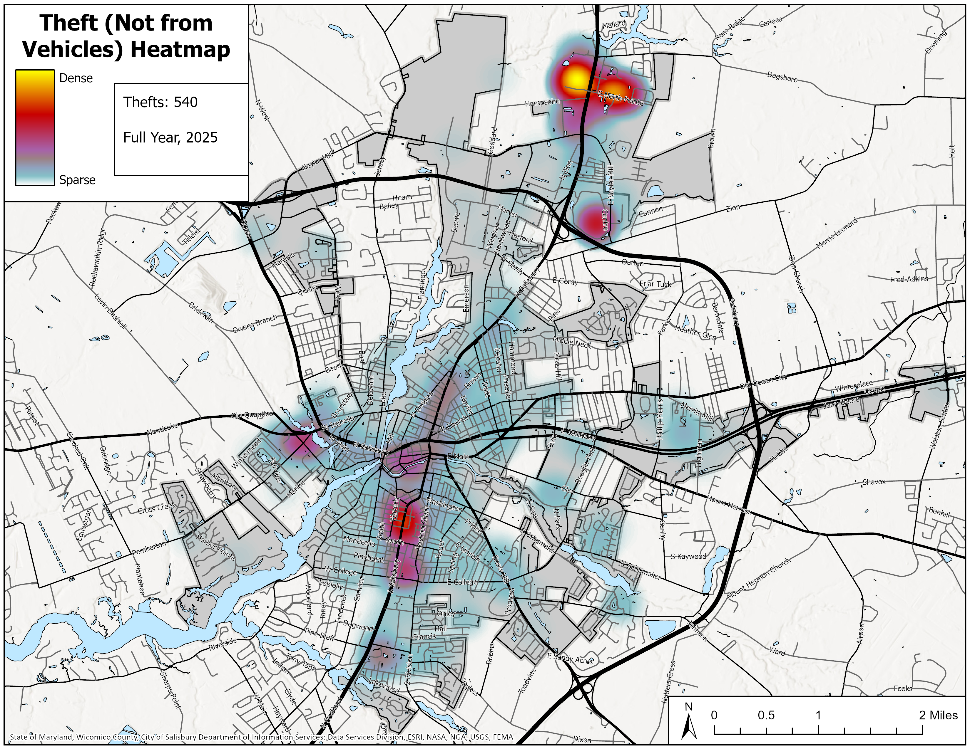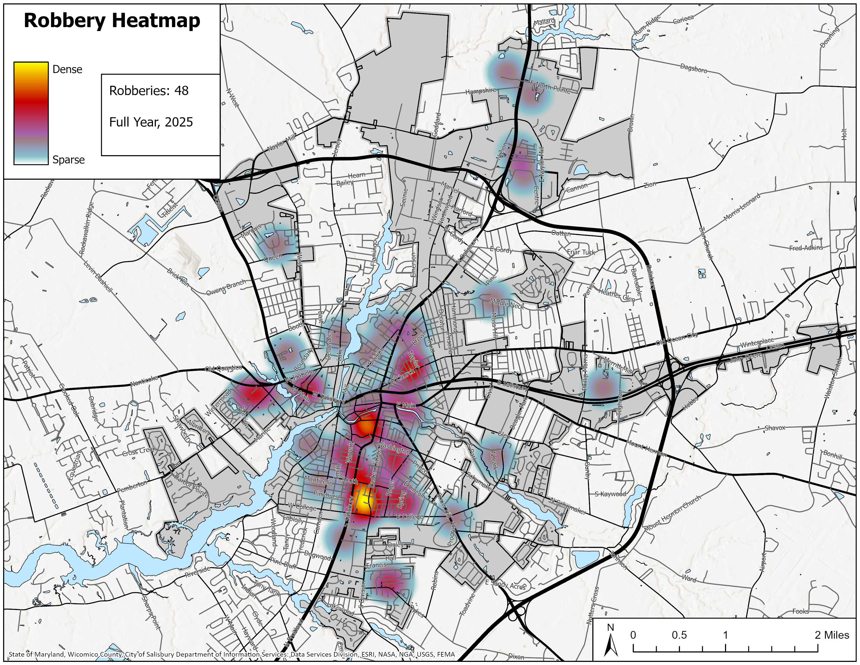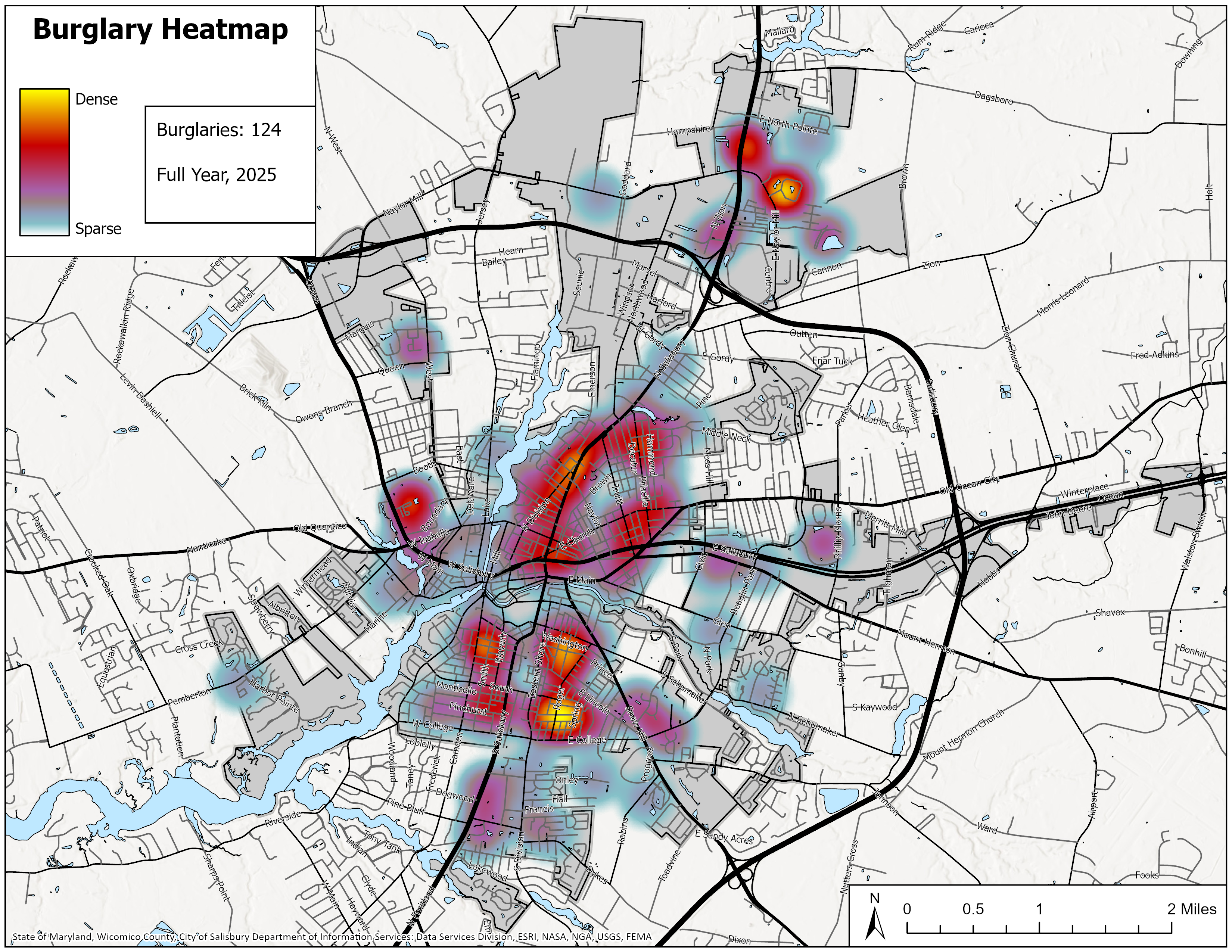 Click on links below to view maps of Part One crimes by police beat. The City of Salisbury has approximately 130 "beats" or reporting areas. New “beats” are added as land is annexed into the city. Beats vary considerably in size. “Part One” crimes are selected offenses police agencies must report to the FBI’s Uniform Crime Reporting Program and include Murder, Non-Negligent Manslaughter, Forcible Rape, Robbery, Aggravated Assault, Burglary, Larceny-Theft, Motor Vehicle Theft, Human Trafficking, and Arson