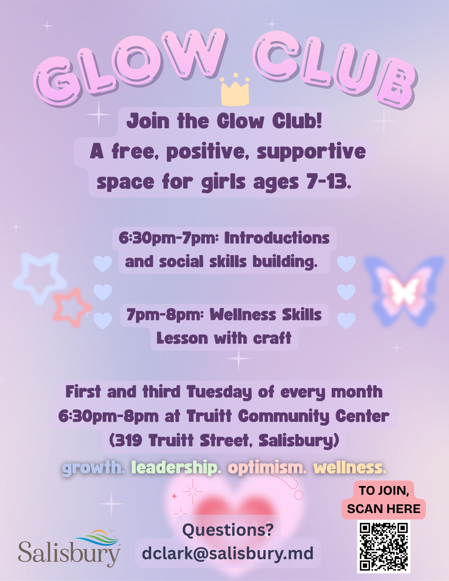 The G.L.O.W. Club (Growth, Leadership, Optimism, Wellness). A supportive and empowering program for girls ages 7–13 starting December 2nd. The club provides a safe space to build confidence, develop leadership skills, and form positive, meaningful friendships. Through guided activities focused on personal growth, wellness, teamwork, and creative expression, participants learn practical life skills while discovering their own strengths. Our goal is to offer a consistent, uplifting environment where every girl feels seen, supported, and capable of making a difference in her community.