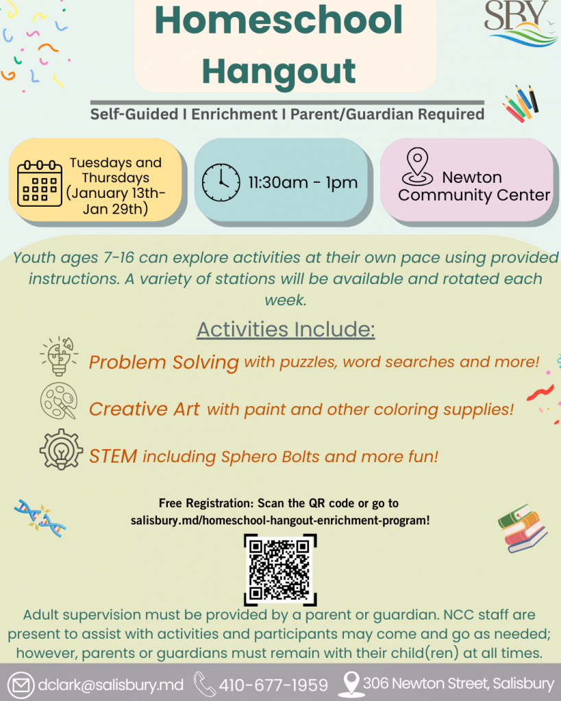 “Homeschool Hangout” Enrichment Program Homeschool Hangout Registration Form Homeschool Hangout Registration Form for Newton Community Center Child's Name:(Required) First Last Child's Name #2 (if applicable) First Last Age of Child(ren):(Required) What sessions will you and your child(ren) be attending?(Required) January 20th, 2026 January 22nd, 2026 January 27th, 2026 January 29th, 2026 Select AllHow did you hear about this program? Friend Instagram Facebook Other: Contact InformationParent/Guardian Name:(Required) First Last Parent/Guardian Name #2: First Last Best Contact Email:(Required) Enter Email Confirm Email Best Contact Phone Number:(Required)Emergency Contact:(Required) First Last Emergency Contact Phone Number:(Required)