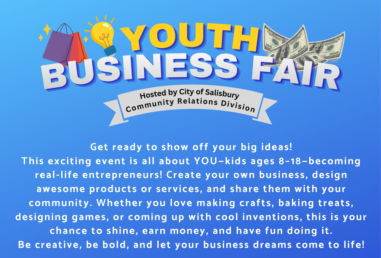 Thank you for your interest in participating in 2026 Youth Business Fair! The date is June 6, 2026 from 12:00-3:00pm. This year's event is being held at the Centre at Salisbury Mall! The mall will be providing a table and 2 chairs for each business. If you have any questions or concerns, please contact me at [email protected] or 410-341-9550